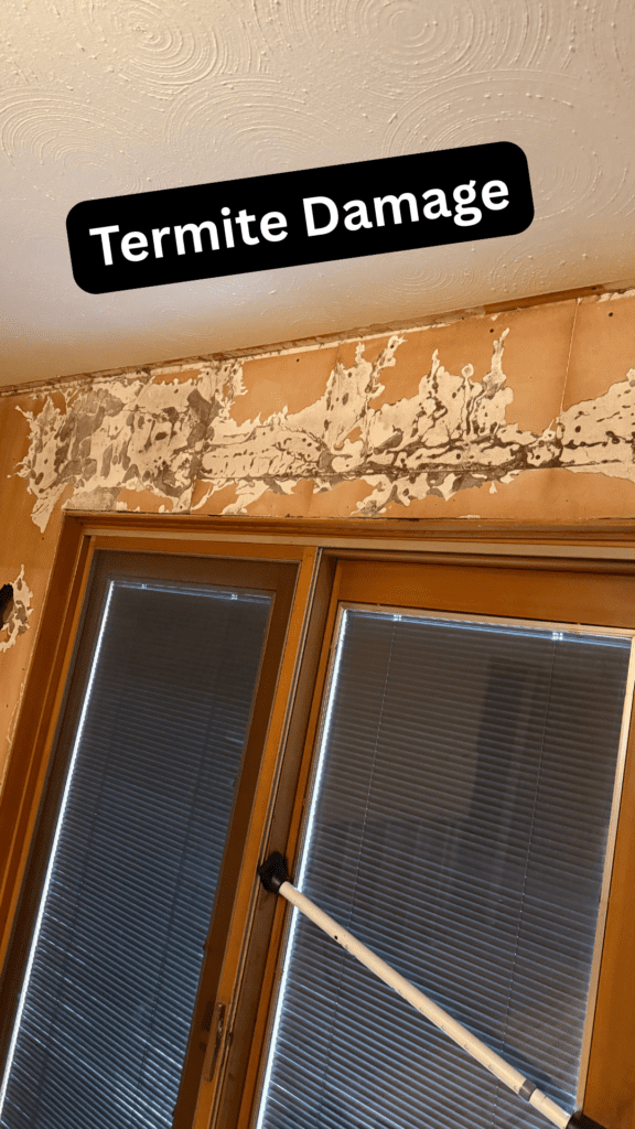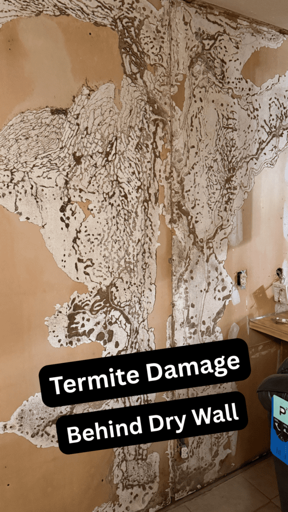 This is one of the reasons we call termites “silent invaders”. This home had termites behind the drywall, quietly eating away inside the walls. You can see how large the mud tubes got, which termites use to travel back and forth from their food source.